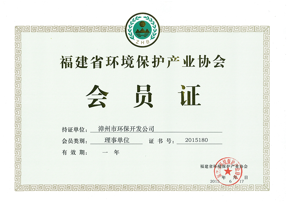 • 福建省環(huán)境保護產(chǎn)業(yè)協(xié)會會員證